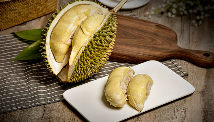 它的开法有两种。对于成熟后的榴莲只需用水果刀沿着裂缝慢慢撬开,沿着外皮划一圈就能掰开。对于未成熟的,则需仔细观察榴莲顶端,会发现顶上有几条线。用尖刀沿着线向下扎,注意别用力太大,扎进去2厘米左右,然后沿着线切开8厘米左右。用手抓住切开的壳,稍用力一掰就开了,香气扑鼻的果肉就出来了。